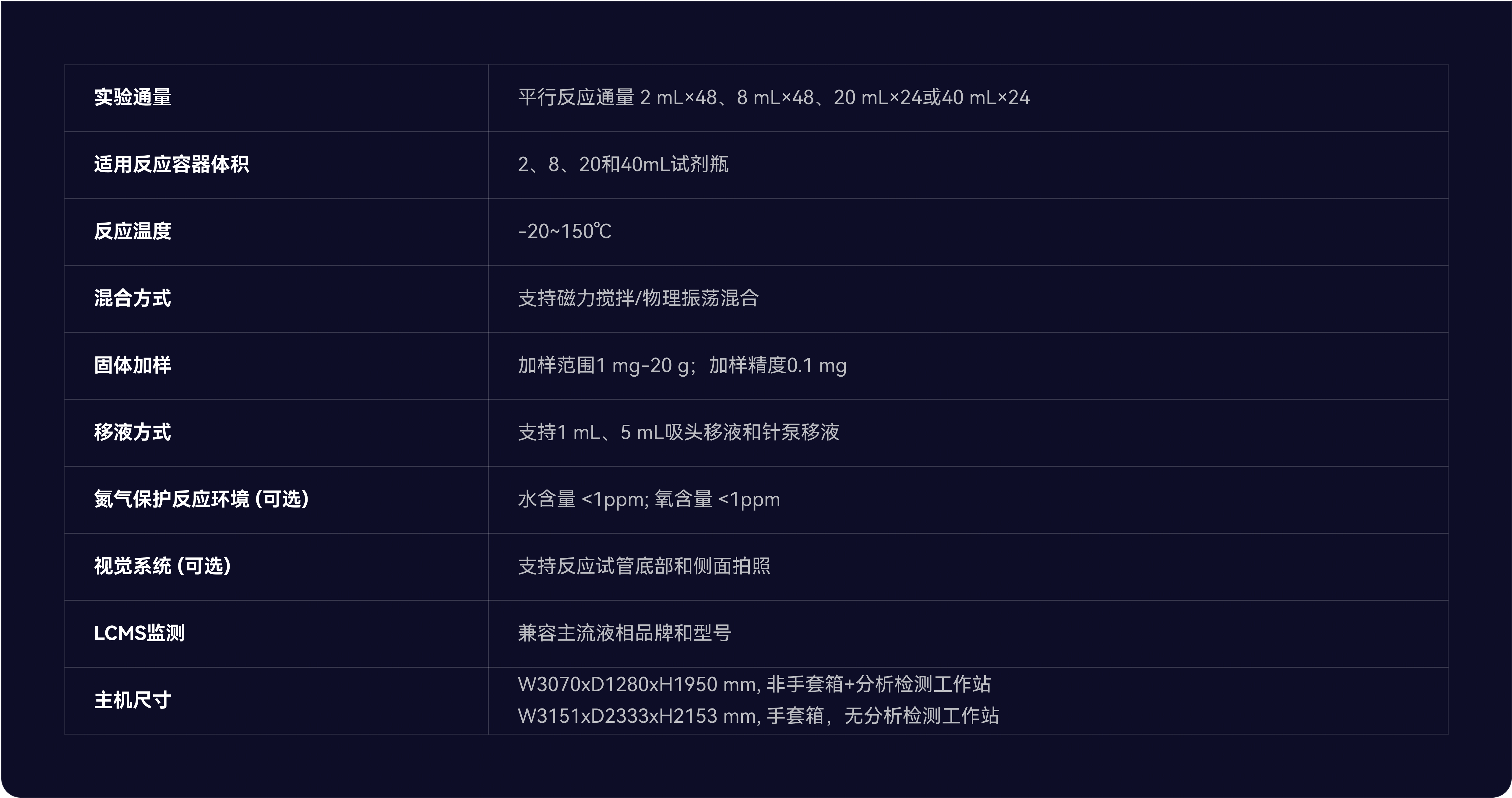 实现合成实验中投料、反应、产物稀释、转移、过滤和液质分析全过程自动化,可根据研发需求配置不同反应体积、温度条件、惰性气氛条件和实验操作方式,完成自动LCMS谱图分析与产物峰面积计算,AI判断产物是否满足后续反应步骤质量要求。突破传统人工合成筛选反应条件低效的瓶颈,实现高通量实验参数优化,解放实验室人力,极大的提高效率。