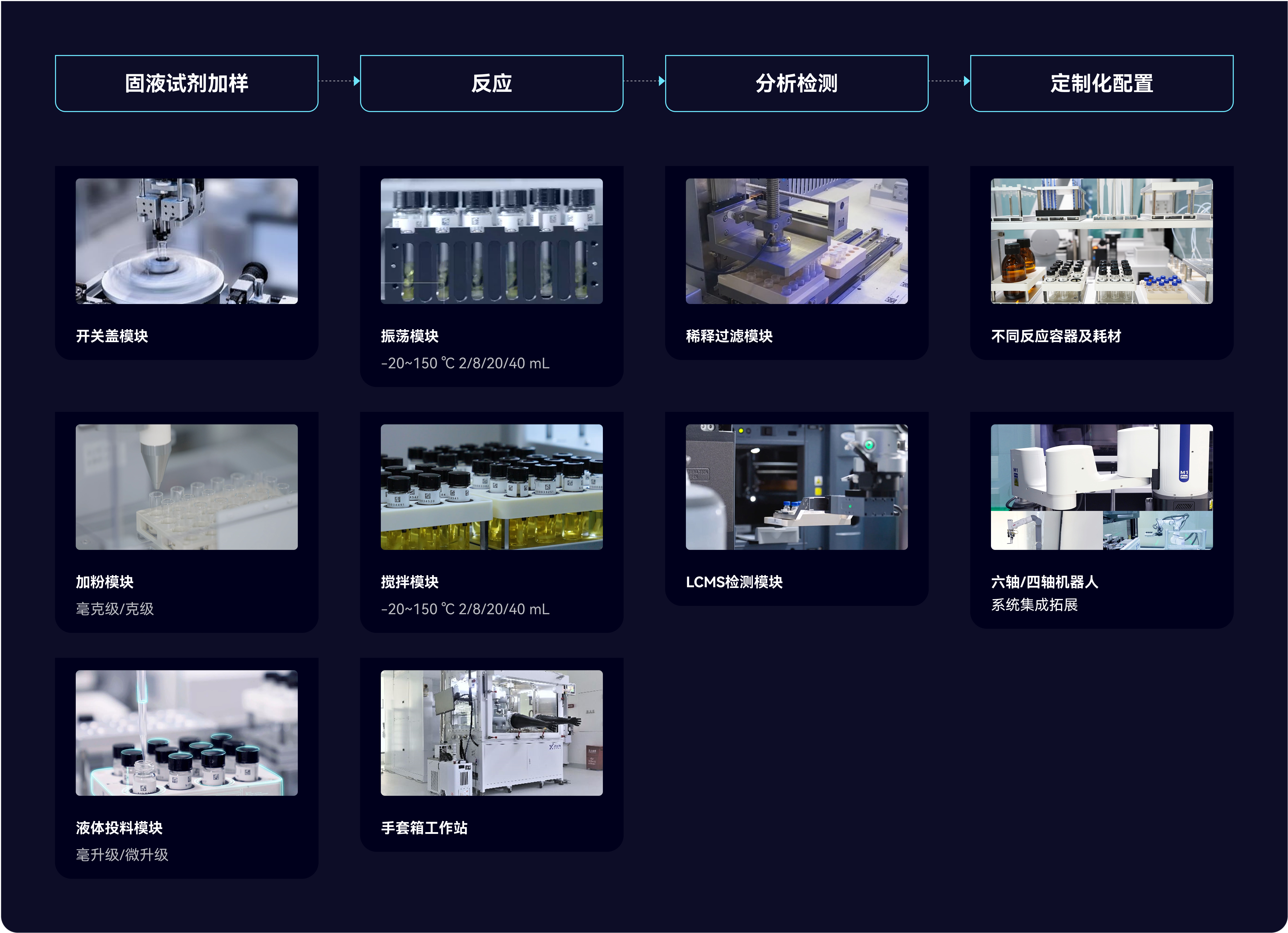 根据不同应用场景,兼容不同反应容器,六轴/四轴机器⼈系统支持集成多种自动化模块
