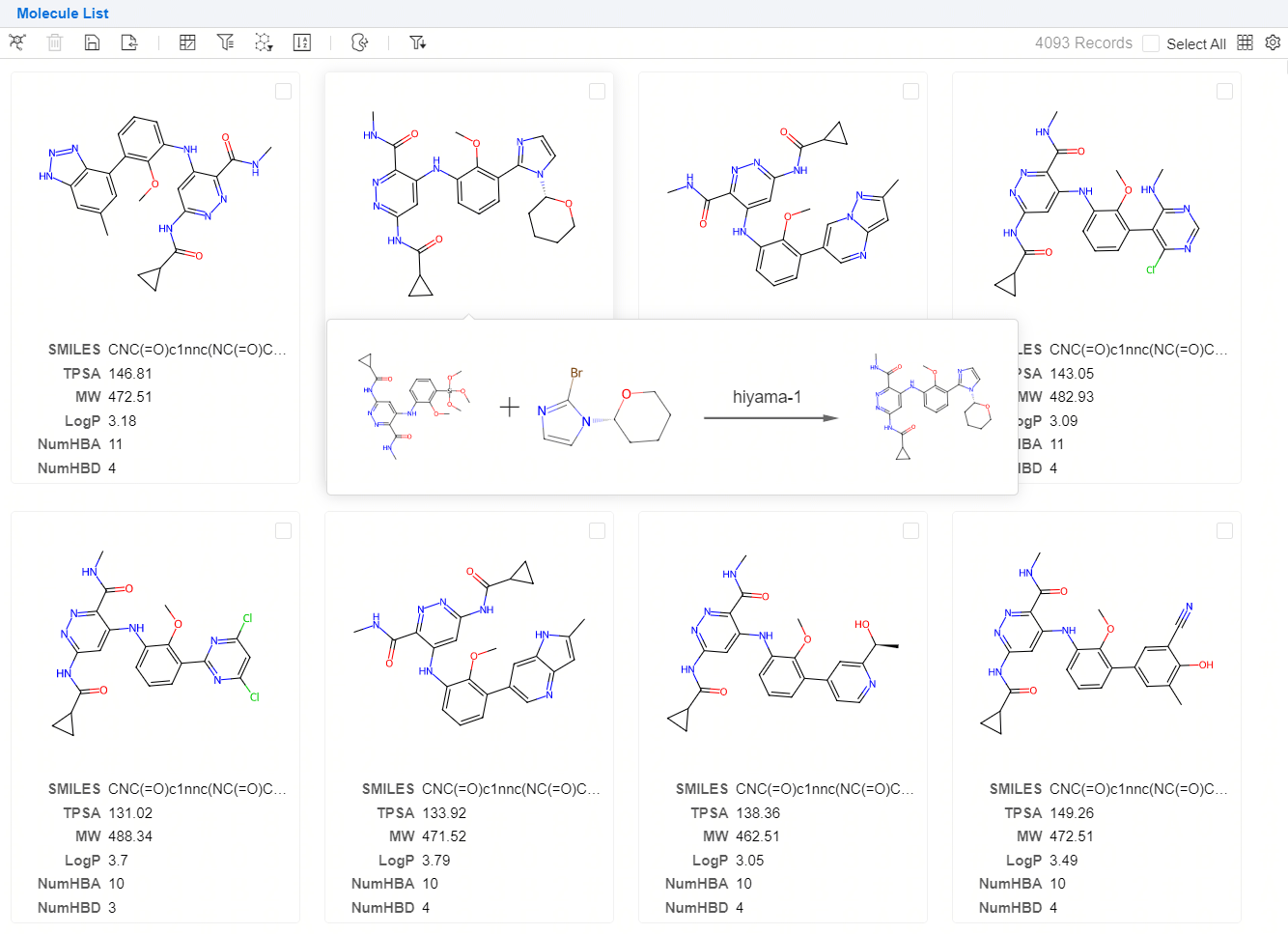 - 化合物库生成简洁明了的展示生成分子结果, 并为每个分子展示相应的反应路径和砌块信息。