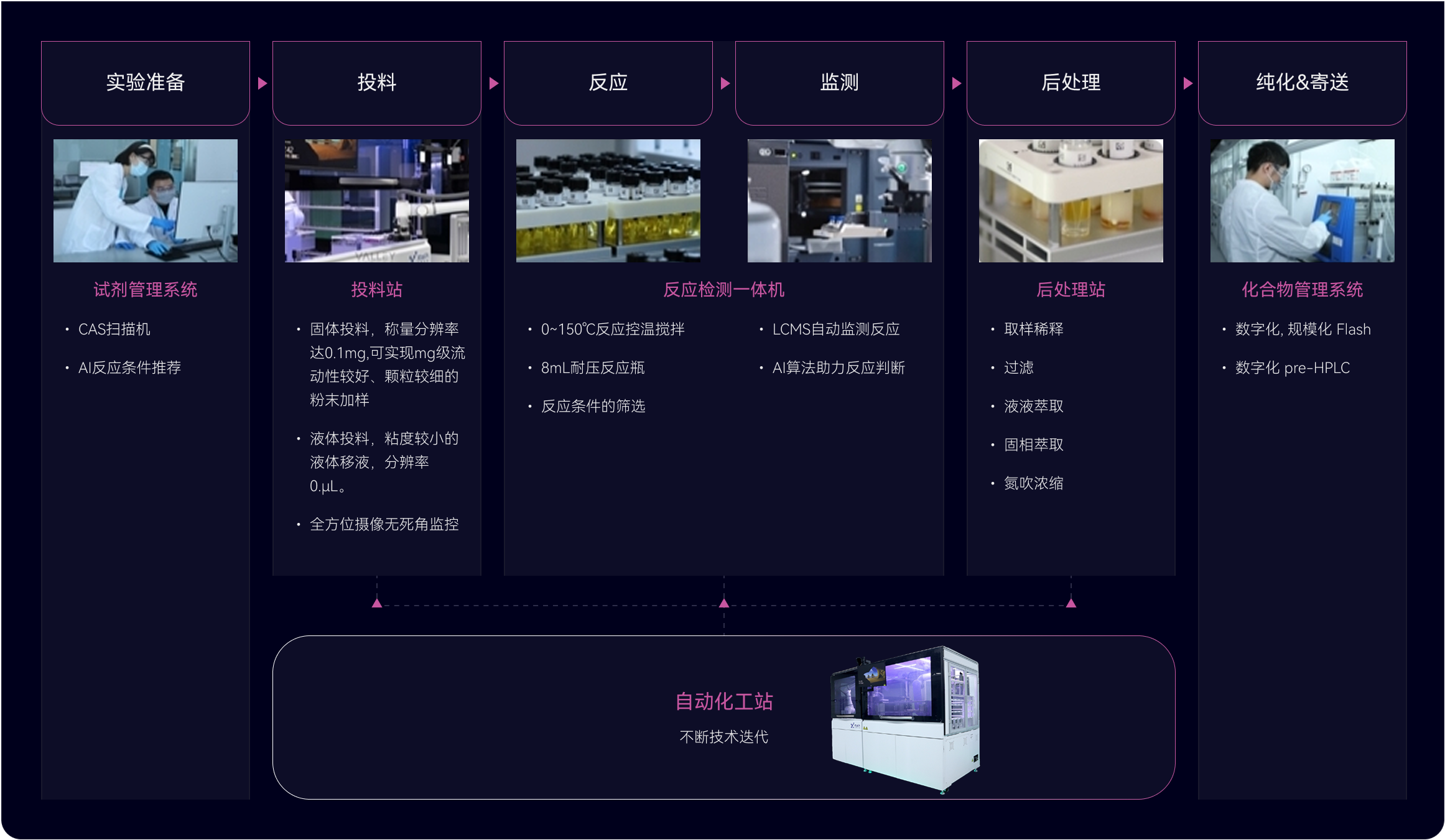 自动化工站24小时不间断工作,高通量高效并行反应,提高工作效率