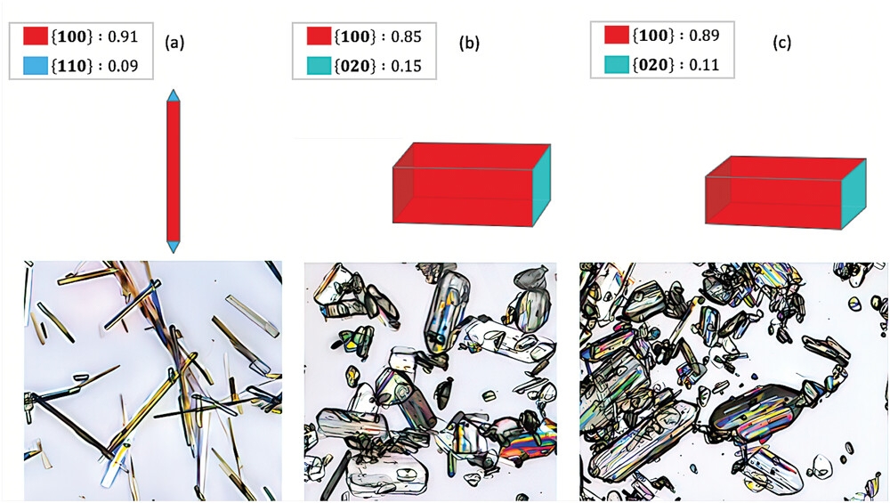 晶泰科技采用多种模型对给定晶型在不同结晶条件下的晶体形貌进行预测,探究溶剂种类、过饱和度、温度等因素影响下晶习的可变性与可调控性,从而更有目的地通过调节结晶参数改变原有的晶习,加速结晶工艺开发。