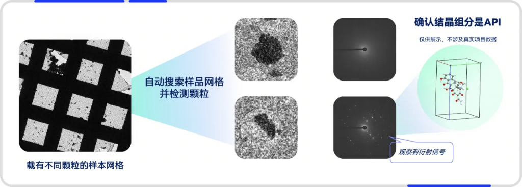 由于可以直接使用粉末样品、避免了耗时漫长的培养单晶的过程,MicroED 相比于 SCXRD 可以显著缩短晶体结构解析的项目周期,还可以高通量进行大量颗粒的衍射数据收集,因此研发人员选择使用 MicroED 技术来分析目标 ASD 体系中的微量结晶组分种类。