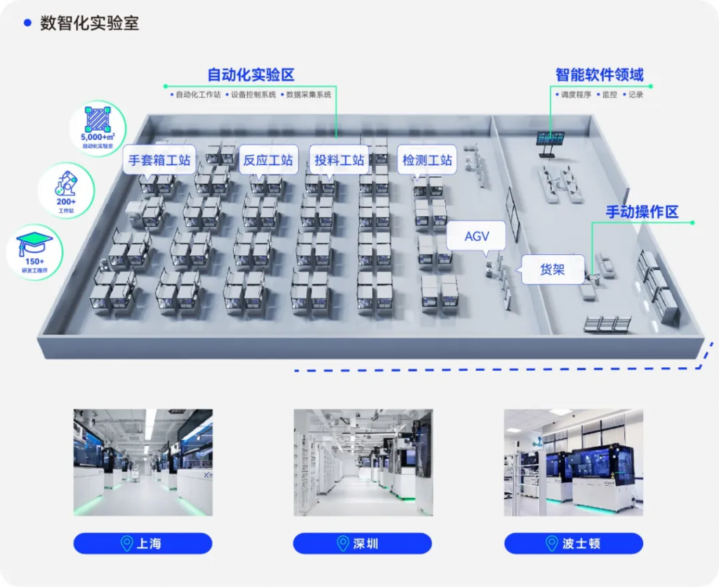 晶泰科技的自动化实验室采用人机结合模式实现了实验过程的高度自动化和智能化,通过智能调度系统远程操控百台规模自动化工站和 AGV 小车,同时提升实验过程和物料传送的效率。